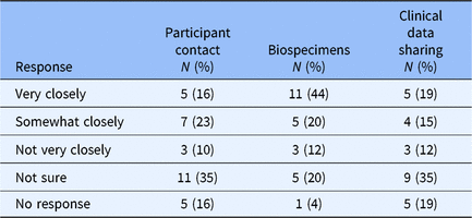 Qualitative survey responses indicated key support strategies, including capacity and confidence for staff and patients to reliably record/track participant decisions over time, clear understanding of practical use of honest brokers plus auditing processes to buttress confidentiality protections, and use of educational materials (e.g., brochures, videos) shared directly or via the patient portal. The literature on needs of research participants echoes some of these challenges, indicating difficulty in understanding the potential nature and scope of future unspecified research.Reference Garrison, Sathe and Antommaria7