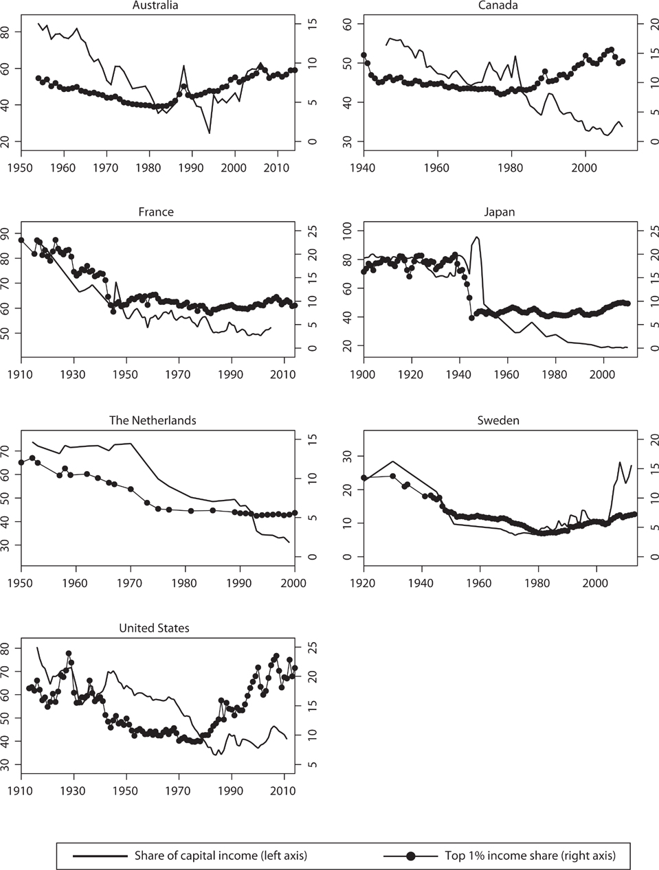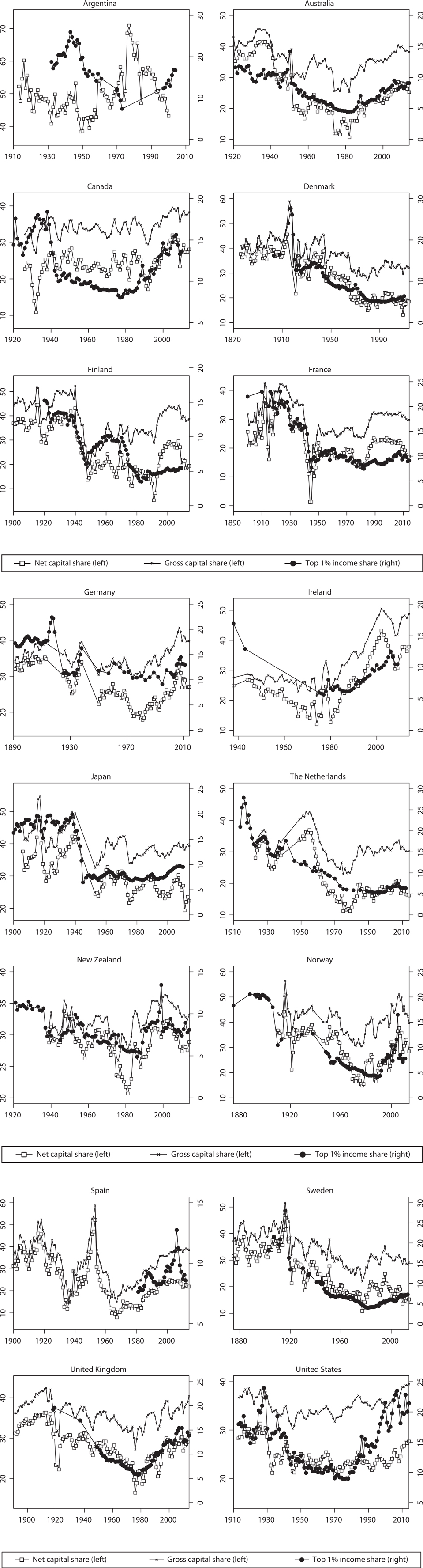 We begin by depicting the long-run evolution of the net capital share and top percentile income shares in the 16 countries for which we have both data series. The patterns are not uniform across countries; there are substantial differences in levels, trends, and in the degree of variability of the series. The net capital share lies mostly between 20 and 30 percent of value added, but one-fifth of values are either below 15 percent or above 40 percent, documenting the large variation. The top 1 percent income share also varies over time, and in most countries there is a clear co-variation (especially Denmark, Sweden, and Japan), but in a few cases this relationship is not at all so strong.