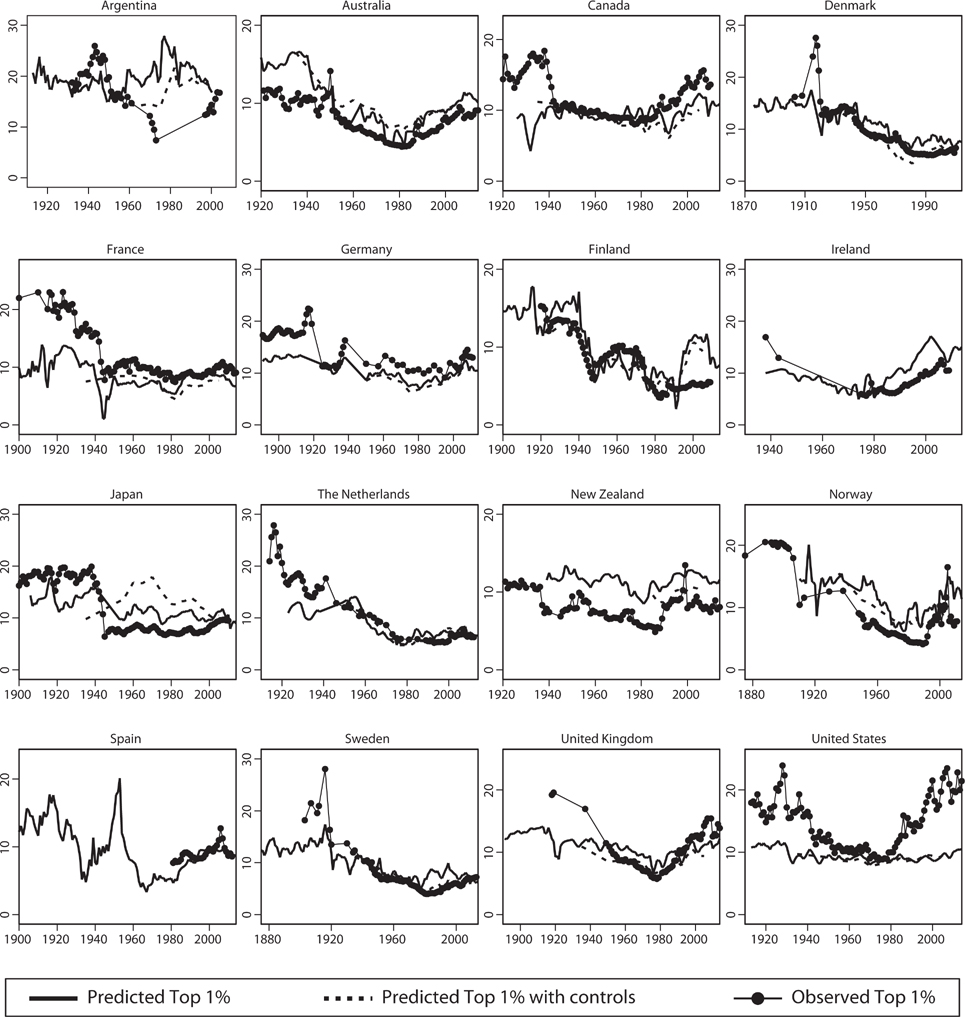 There is an interesting pattern in the deviation between the predicted and the observed top shares, and one way to see this is to discuss this pattern separately across historical sub-periods. First, looking at the pre-WWII era, eight of the 16 countries have predicted top shares that are lower than the observed top shares in WID. The difference is largest in France, Germany, Sweden, the United Kingdom, and the United States, where observed top shares are almost twice as large as the predicted ones. For example, the top 1 percent share in France in 1900 was 10 percent according to the actual data, but almost 22 percent when “post-dicted” from the capital share. Second, in the early postwar era the predicted and observed shares are similar except in four countries where predicted shares are higher: Argentina, Australia, Japan, and New Zealand. In four other countries, the predicted and observed shares are at the same level. Third, in the post–1980 era, predicted shares are lower in three countries (Australia, Finland, and New Zealand), higher in two (Canada and the United States), and at about the same level in the other countries.
