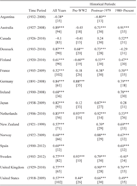 Note: Pearson correlations for cases with at least ten observations “Pre-WWII” denotes years before 1939, “Postwar-1979” years 1950–1979, and “1980–present” years since 1980. Number of observations in brackets.