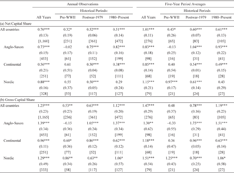 Beginning with the net capital share results (panel a), over the whole country sample there is a positive and statistically significant coefficient between the logged top percentile income shares and logged net capital shares, at 0.76 and 1.01 in the annual and averaged samples, respectively. These coefficients in the log-log model can be interpreted as elasticities, thus suggesting that a 10 percent rise in the net capital share is associated with between 7 and 10 percent increases in the top percentile income share. The coefficients are lower in the sub-periods when we permit average effects to vary, around 0.4 in the pre-WWII era and higher at around 0.5–0.6 in the two postwar eras. In other words, over the century-long perspective, there is a quite robust, almost one-to-one, relationship between the net capital share of value added and the income share earned by the highest-earning percentile.