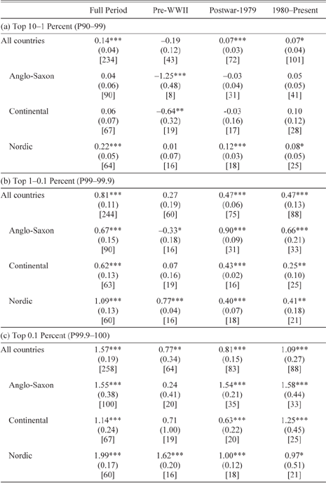 The table also shows the regression coefficients for different country-groups over the entire century as well as over the sub-periods. Once again, the pattern from the top percentile analysis carries over to the rest of the top groups, but much weaker so for the groups lower down in the top and much stronger in the absolute top. The association is the strongest in Anglo-Saxon countries, especially in the recent era, whereas it is the weakest in the Nordic countries.