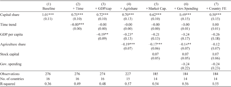 Note: Panel regressions with logged top income shares as dependent variable on logged capital shares and other logged controls (equation (2)). “Agricultural share” denotes employment share in agriculture, “Stock capital” is total stock market capitalization as share of GDP, and “Gov. spending” is central government spending as share in GDP. Observations are in five-year averages. Robust standard errors in parentheses.