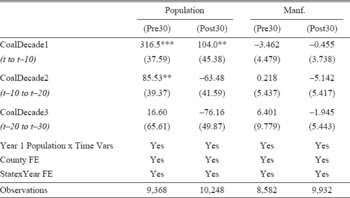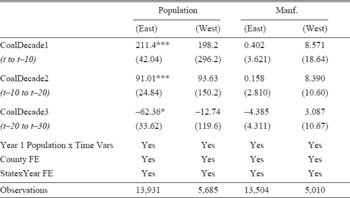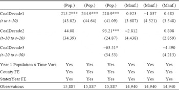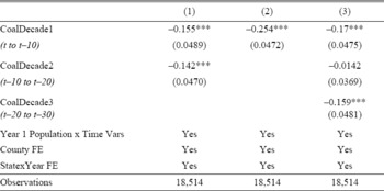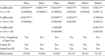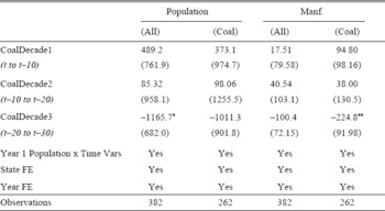 The first measure of CoalDecadect contains cumulative county coal production in millions of net tons from year t to t–10. The second measure contains cumulative county coal production from year t–10 to t–20, and a third measure contains cumulative county coal production from year t–20 to t–30. For example, if the year is equal to 1920, this variable would contain measures of production form 1890–1900, 1900–1910, and 1910–1920 in that county. The coefficient of the most recent decade, relative to year t, captures the net short-term impacts of coal mining on county population and manufacturing. The coefficients of the second and third measures in CoalDecadect capture longer-term lags in the impact of coal mining, which will measure the mine life-cycle effects on population and manufacturing activity. Combining the coefficients informs us about the overall impact of coal mining on population or manufacturing over a long time period.