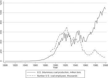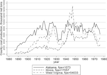 A within-country investigation from 1870 to 1970 will also allow the analysis to focus more directly on causal factors aside from the political economy and institutional structure. By 1870 the United States had established a basic set of property rights, protections of individual freedom, rule of law, and federal structure of state, local, and national governments, which has been largely consistent over time. Paul David and Gavin Wright (Reference David and Wright1997) present evidence that these institutions were one of the many reasons the United States was able to exploit its resource endowment more effectively than other countries. Wright (Reference Wright1990) argues that mineral supplies were “more a matter of development than endowment,” and that historical resource abundance in the United States was a result of industrial success and progress. Using the United States from 1870 to 1970 will address how coal mining activity and the boom and bust nature of extracting natural resources shaped local economies in a situation where the impact of national level institutions and their enforcement were fairly uniform.