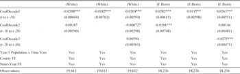 Table 2 shows the results of fixed effects specifications, in non-urban counties, that explore potential differences in the effect of coal production over time on the composition of the county population. The dependent variables are the percent of the county population that is white or foreign born, which were obtained from Haines (Reference Haines2010) for each decennial year.Footnote 9 In the full specifications the short-term effect of the production of one million tons was to raise the share of foreign born by 2.6 percent, while lowering the share of whites by a similar 2 percent. The long-term effect of coal production decreased the share of foreign born by 2.8 percent, more than offsetting the original increase. These short- and long-term fluctuations are most likely driven by the net migration of foreign and non-white coal miners and their families into and out of coal mining areas. The pattern here suggests that immigrants found coal mining to be an attractive occupation, but that once they gained more experience in the United States they migrated to other locations. The impact on the foreign born was likely complicated by the slowdown in immigration caused by the World Wars, Depression, and immigration limits imposed in the 1920s. The results also suggest the non-white population may have been more inclined to migrate to and stay in the coal mining areas. Overall, these results align with prevailing notions of who was working in the coal mines in the United States, and that these workers were mobile.
