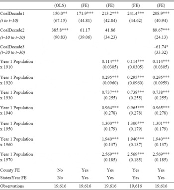 where Yct is the outcome measure in county c and census year t, and will include county-level population measures and manufacturing activity. The coefficients of interest are the coefficients for the vector of cumulative county coal production, CoalDecadect , over the three previous decades. To capture the long-term effects of initial settlement before coal production began, I include a series of interaction terms between the initial county population and dummy variables for each census year. For example, for an observation in 1910, this variable would be the population in the county in 1870 interacted with a dummy variable corresponding to year 1910. County fixed effects are included to control for any time invariant characteristics at the county level. These would include: geography, elevation, ruggedness, agricultural suitability, and climate. State-by-year fixed effects are included to take into account any state specific shocks from year to year. This would include any heterogeneous institutional changes, like unionization rates, technological advances and utilization, or changes in infrastructure investment.Footnote 6 The state-by-year fixed effects also capture the impact of national changes, like the World War and the Depression, which may also have had heterogeneous impact in different states.