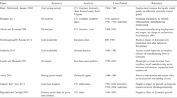 Numerous studies have attempted to understand the economic consequences of natural resource extraction. Many of these studies illustrate the importance of organizational and institutional conditions to the economic consequences of mineral production, and have been done using cross-country comparisons where large differences in local conditions can exist (Mehlum, Moene, and Torvik Reference Mehlum, Moene and Torvik2006; David and Wright Reference David and Wright1997; Sachs and Warner Reference Sachs and Warner2001). Also, many of these studies are focused on the post-1945 era, implying the resource curse may be specific to the conditions in the developed and developing world during this timeframe. As summarized in the Appendix, others have investigated the economic consequences of resource extraction within a specific geographical area over time (Black, McKinnish, and Sanders Reference Black, McKinnish and Sanders2005; Michaels Reference Michaels2011; Caselli and Michaels Reference Caselli and Michaels2013; Papyrakis and Gerlagh Reference Papyrakis and Gerlagh2007; Allcott and Keniston Reference Allcott and Keniston2014; Glaeser, Kerr, and Kerr Reference Glaeser, Pekkala Kerr and Kerr2015).Footnote 1 There is also an extensive literature that chronicles the importance of natural resources to industrialization in North America and Europe (Wright Reference Wright1990; Chandler Reference Chandler1972; Gutberlet Reference Gutberlet2013; Fernihough and O'Rourke Reference Fernihough and Hjortsh⊘j O'Rourke2014; Keay Reference Keay2007; Clark and Jacks Reference Clark and Jacks2007). This study contributes to the existing literature by capturing both the short- and long-term net impacts of up to 30 years of coal mining on local areas, over multiple expansions and contractions in activity.