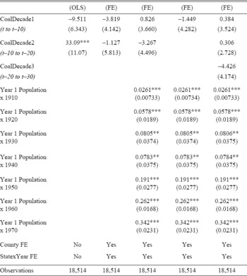 The first decade effect of coal activity shown in Table 1 aligns with the prevailing notion of a surge in population when a coal expansion occurs. It is similar to that found in Michaels (Reference Michaels2011), where oil abundance, higher wages, and infrastructure investment attracted population at the county level from 1890 to 1990 in the southern United States. However, the results suggest that the negative effects of mining activity, like pollution, began to have an effect on the local population in approximately the third decade after production. The results for the initial population and census year interaction terms show the importance of early settlement in the counties increased in magnitude over time. In 1910 the relationship with initial population was small, and by 1970 an additional person in 1870 added 2.6 people to the population. These results are also consistent with the idea that the local impact of resource production is dependent on transport costs (Wright Reference Wright1990; Chandler Reference Chandler1972). Many coal areas were developed in remote areas. The time-varying impact of coal production on local population could suggest transport costs were decreasing over time within each county, relative to when production occurred, thereby reducing the amount of local economic activity related to past coal production.