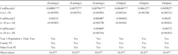 In the full specification with county and state-by-year fixed effects, the impact of mining activity is identified by changes over time within each county, while controlling for state specific shocks in each census year.Footnote 7 The estimation strategy uses within county variation in coal mining activity over time, around a long-term average, to identify the time-varying net effects.Footnote 8 By including counties without coal mining in the sample, the results should be interpreted as the average net impact of possessing and extracting differing amounts of coal over time, versus not possessing the ability to extract coal in the county.