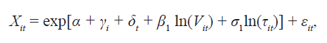 where, again, X it = Q it * P it is the value of imports of sugar from country i in year t, V it is the value of total exports in current prices from country i in year t, τ it is the tariff in shillings per hundredweight, and γ i and δ t are country- and year-fixed effects. As before, I estimate Equation (8) with ppml and robust standard errors clustered at the country-level.