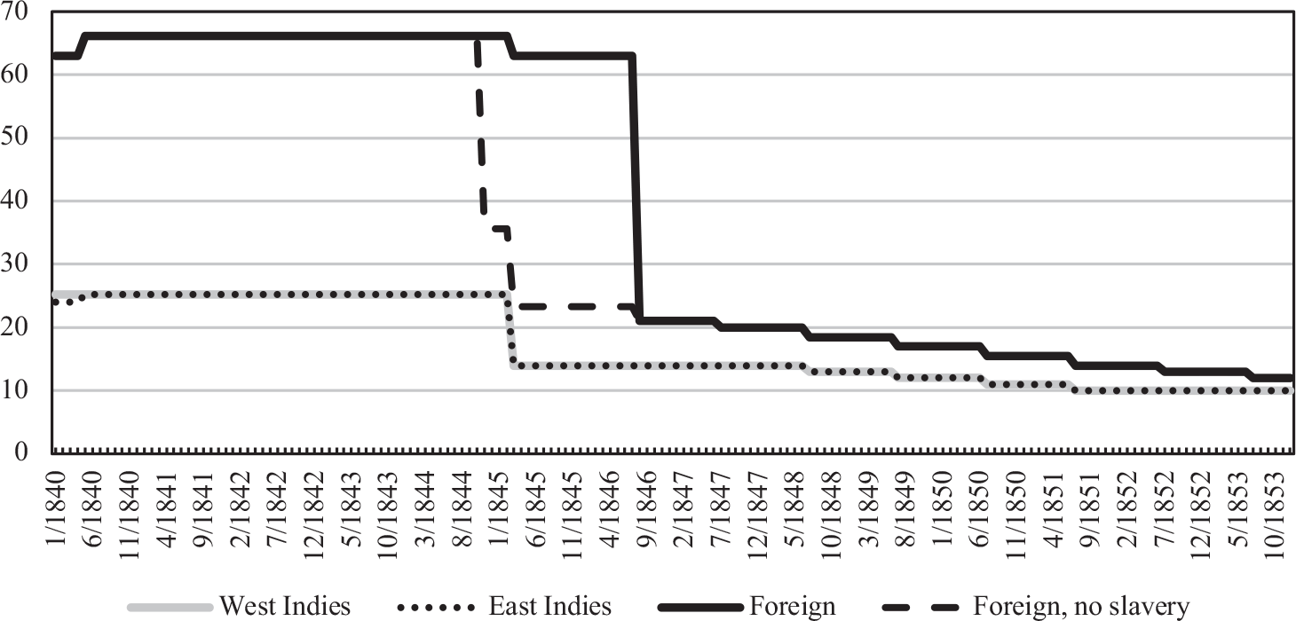 This paper presents the British Sugar Act of 1846 as an illuminating historical example of the welfare effects of tariff reductions. I construct a new monthly series of sugar price and import volume data for a sample of ten countries between the years 1840 to 1853 to estimate three elasticities: (1) the tariff price elasticity, (2) the trade price elasticity, and (3) the “trade elasticity” (tariff trade elasticity). Using these elasticities, I calculate three welfare indicators: the pass-through coefficient and the consumption effect (compensating variation), the size of the reduction of the deadweight loss, and the gains from the trade in sugar to the British economy. By separating the elasticities for the sub-sample of slave economies (Brazil and Cuba), I calculate each of these indicators for both slave and non-slave-grown sugar. The results highlight important welfare gains for British consumers. My estimates suggest that the reduction of the duty on noncolonial sugar was associated with increases in sugar consumption of between 31 and 43 percent of pre-Sugar Act levels, as well as a reduction of the deadweight loss of around 41 percent of sugar import value. The overall gain from the Sugar Act, however, was most likely negligible: between –0.15 and 0.05 percentage points, depending on the choice of elasticity. These tiny gains from trade, however, were driven by large losses by the British West Indies (–0.34 percentage points), which more than offset considerable gains by noncolonial suppliers (0.15 percentage points). My calculations show that most of these gains were generated by increased trade with the slave economies; 57 percent of the consumption effect, 95 percent of the reduction of the deadweight loss, and a substantial portion of the increase in the gains from trade were associated with Brazil and Cuba alone.Footnote 1 Given the importance of the British sugar market at the time (especially for Brazil), it is not unrealistic to posit that the Sugar Act acted as a boost for slave-based plantation production in these countries.Footnote 2