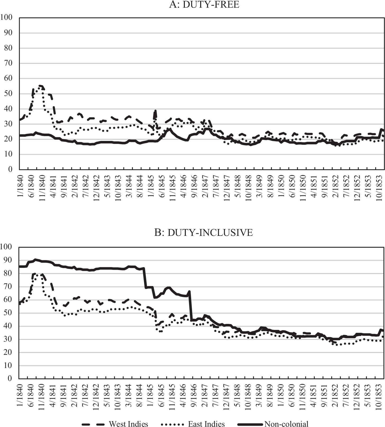 To estimate the elasticities necessary to assess the welfare impact of the Sugar Act, I exploit monthly data on the prices and volumes of raw sugar imported to the ports of London and Liverpool during the period January 1840 to December 1853. I use data from two cities because the data for prices in Liverpool and volumes in London are imperfect; the former aggregates the British West Indies into a single series while the latter are not consistently reported. However, a comparison of the London price series with price data for Liverpool and the Liverpool volume data with an annual series of sugar imports at the national level show that both series are representative of the nation-wide trend.Footnote 7 The price data for London is derived from several British commercial newspapers, namely John Bull and Bell’s Weekly Messenger, with data for the period May 1852 to December 1853 from the Shipping and Mercantile Gazette. The price data consists of monthly observations by origin and quality. Minimum and maximum prices are given for each variety in shillings per hundredweight (s/cwt), of which I take the average. I also average prices by quality, including values for different grades of “brown” and “yellow” sugar in the muscovado category and including higher grades in the white category. The prices of colonial sugar are duty-paid, while all others are presented duty-free (“in bond”), so I add the specific duty to the latter prices to calculate the duty-paid price. Monthly series are preferred to the annual series of volumes from the official statistics for several reasons: higher frequency data allow for the detection of short-run effects of tariff reform, and, as declared values were not used until 1853, unit values are missing from the official sources.