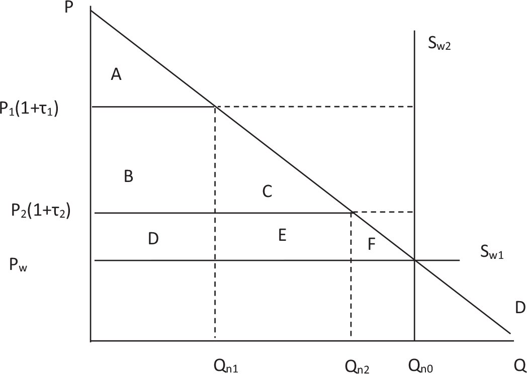 Figure 3 models the effect of a tariff reduction on deadweight loss (DWL) when the foreign export supply is (a) perfectly elastic (Sw1) and (b) perfectly inelastic (Sw2); Pw is the foreign export price and P1(1+τ1) is the duty-paid import price before the tariff cut. In the case that supply is perfectly elastic, consumption is at Qn1. Area A is the difference between the consumer’s marginal value and the amount paid for the imported good: the consumer surplus. Area BD is the amount gained in tariff revenue for the government, equal to Q1*τ1. Area CEF (under the demand curve) is the DWL generated by the presence of the tariff. The reduction of the tariff reduces the price to P2(1+τ2). Consumption increases to Qn2. The consumer surplus increases to ABC. Tariff revenue is DE. The DWL generated by the new tariff is F. The difference between DWL1 and DWL0 is the reduction of the DWL. Amiti, Redding, and Weinstein (Reference Amiti, Redding and Weinstein2019, p. 190) observe that the welfare effect of a tariff depends on how steep the export curve is. For suppliers with greater elasticities, the reduction of the DWL will be larger. This can be demonstrated by comparing the case of export supply with perfect elasticity with that of perfect inelasticity. In the latter case, supply remains at Qn0 regardless of the price. Thus, at P1(1+τ1) there is an excess of supply (equivalent to Qn1 - Qn0), consumer surplus remains at A, and tariff revenue is BCDEF. As there is no loss of consumer surplus or revenue due to the intervention, there is no DWL. A reduction of the tariff to P2(1+τ2) simply transfers revenue from the government to the consumer, as consumer surplus becomes ABC and tariff revenue DEF. As the foreign export curve becomes more elastic and Sw2 gradually shifts to the right toward Sw1, the size of the DWL before the tariff cut (P1(1+τ1)) becomes CEF.