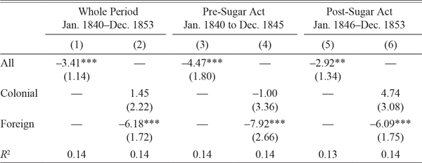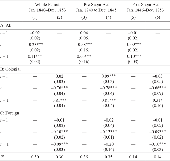 This significant increase in the tariff pass-through coefficient reflects a composition effect: the shift from inelastic to elastic suppliers. This is illustrated by the results in Panels B and C of Table 1, which display the coefficients for colonial and noncolonial suppliers, respectively. Inspection of the coefficient for the whole period in Column (2) immediately reveals a large degree of heterogeneity across suppliers: colonial exporters absorbed 76 percent of the tariff reduction, while noncolonial suppliers retained only 10 percent. This was a difference that already existed prior to the Sugar Act (in Column (4)) and continued during the period immediately following its passage (Column (6)). For the colonial suppliers, there was a reduction in tariff absorption from 78 to 66 percent over the two periods, due to the sudden entrance of noncolonial competition in the retained for consumption market. For the latter, the tariff absorption elasticity dropped from 13 to 9 percent following the Sugar Act. The results suggest that there were no anticipatory effects of these tariffs, which is surprising given the length of time that these measures were discussed in Parliament and reported by the British press. The lagged coefficients indicate significant follow-through effects, although the size and direction of these effects depend on the period and supplier.