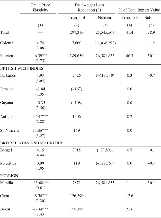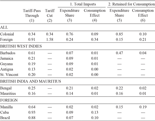 Table 2 displays the estimates of the consumption effect for colonial and noncolonial (“foreign”) suppliers and for each of the ten countries in the sample. Column (1) shows the tariff pass-through coefficient (1 + β 1); that is, the percentage of the tariff reduction passed on to consumers (again, assuming zero markups). As mentioned earlier, with one exception (Barbados, with a coefficient of 0.61), pass-through for the colonies was much lower than for the noncolonial countries included in the sample. The coefficients for the former group of countries ranged from 0.13 (Antigua) to 0.25 (Bengal, representing British India). On the other hand, the pass-through for Manilla was 0.64, and the two slave economies in the sample, Cuba and Brazil, showed the highest coefficients, of 0.93 and 0.88, respectively. Column (2) gives the size of the tariff cut dln(1 + τ i ) for both groups of countries: between January 1846 and December 1852, the tariff for colonial suppliers was reduced by 34 percent and that for noncolonial suppliers by 158 percent. Given that the sizes of these cuts did not vary within each of the groups, the values are not reproduced for individual countries. Column (3) displays the expenditure shares for the countries of the sample. The colonies held around 76 percent of the share over this period, with Bengal occupying the first place (21 percent), followed by Mauritius (14 percent), and Jamaica and Guyana (both with 9 percent of the share). Most of the market share of noncolonial countries (24 percent) was held by Cuba (9 percent) and Brazil (7 percent).