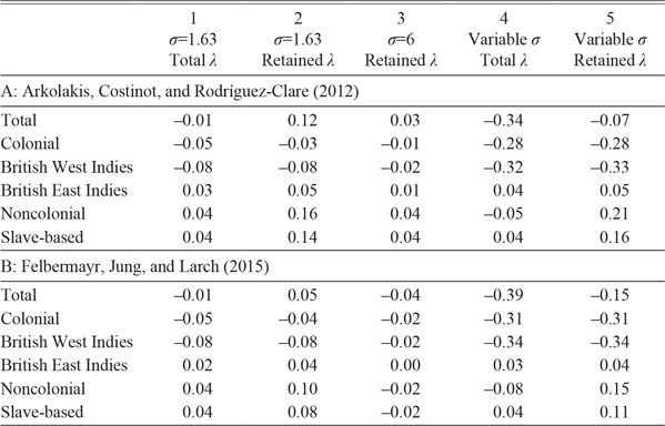 Columns (4) and (5) display the results using country-specific elasticities and both total and retained expenditure shares, respectively. The former shows a larger negative effect (–0.34), which is driven by a greater loss from trading with the West Indian colonies (–0.32). When retained for consumption shares are used, as in Column (5), this latter result is corrected, and the gain from noncolonial trade is large and positive (0.21). These results demonstrate that the assumption of constant elasticities across suppliers, prevalent in the literature on gains from trade, may bias the size and distribution of the gains and losses from trade.