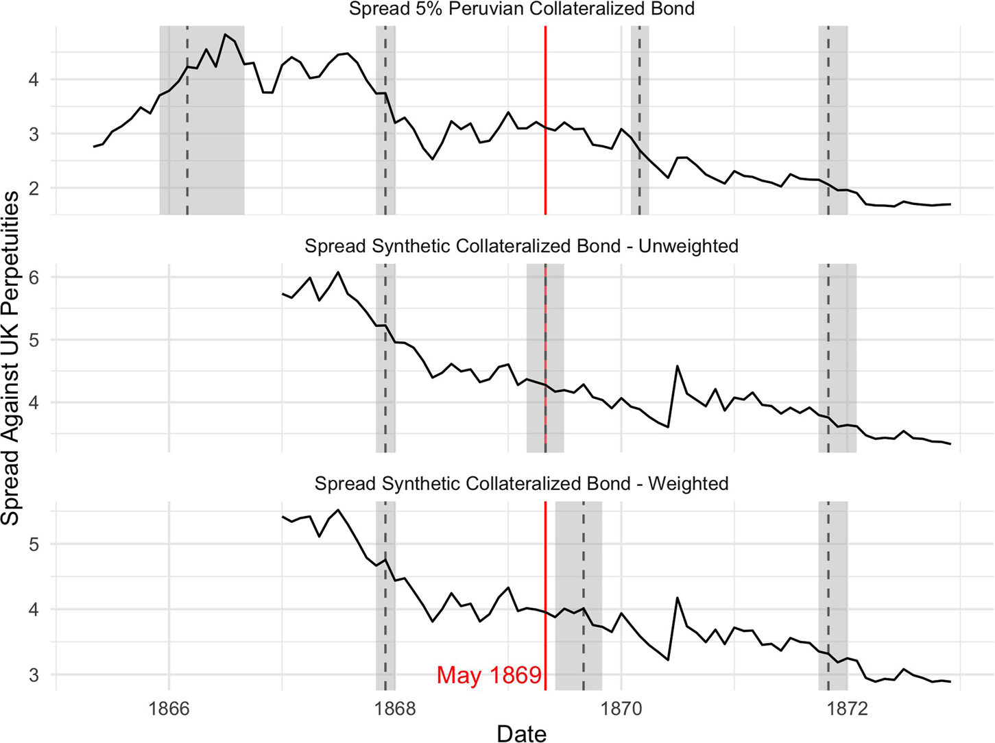 There are two conditions for rejecting the scam theory. The test should not single out Smith as a significant event, and if it does single it out, then spreads should not increase afterward. Figure 1 plots the time series of monthly spreads for the Peruvian bond, the two portfolios, and the structural breaks. Dashed lines capture Bai-Perron break dates, while shaded grey areas represent confidence intervals. For the Peruvian bond and weighted portfolio, no break is detectable. For the unweighted synthetic bond, a break around Smith is identified, but the spread decreases thereafter, which is the opposite of what should happen under the scam theory. The evidence being incoherent with hypothesis (ii), we conclude that Smith was old news, as the Economist had put it. The verdict merely confirmed what the marginal investor already knew, namely that courts would not enforce hypothecations.