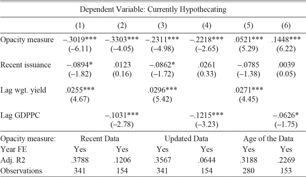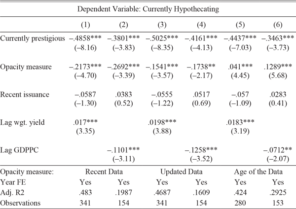 Table 1 shows the result: the less opaque the country, the less likely it was to hypothecate. In particular, Opacity is measured by Recent Data in Columns (1) and (2), Updated Data in (3) and (4), and Age of Data in (5) and (6). Columns (1) and (2) show that a drop in the speed of data updates below “at most two years old” implies an increase of approximately 30 percent in the probability that the last bond issued is a Type I. Columns (3) and (4) show that failure to update increases the probability that the last bond issued by the country is a Type I by about 20 percent. Finally, in Columns (5) and (6), we show that an additional one-year lag in the information disclosed correlates with a 5 to 14 percent greater likelihood of tapping the market with a Type I bond. A 5-year lag increases the probability by 25 percent to 70 percent. In other words, for “absolutely opaque” countries, as a few were, hypothecations were a sine qua non.