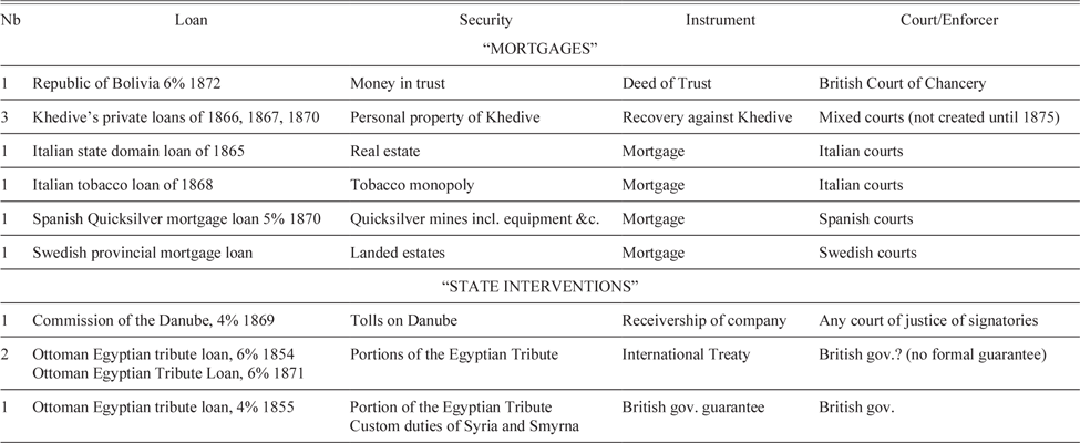 An interesting aspect of Type II securities was that they often paved the way for subsequent state interventions. This is logical, because some were by construction inviting diplomatic mingling. The way the “Khedive Loans” ended up serving as justification for British intervention provides an example. In this case, the trick used to render collateral executable was that the loans were extended not to Egypt but to the ruler of Egypt (the Khedive) in his private capacity, against the pledging of his personal estates. To enable enforcement of the security, Mixed Courts under joint Egyptian and international authority were given jurisdiction over disputes involving the Khedive’s properties “so long as no question of acts of sovereignty arose” (Hoyle Reference Hoyle1986, 1987, p. 437). The result was that the “private” Khedive really placed himself under the reach of an international treaty when he refused to comply with the Mixed Courts rulings, giving Britain legal grounds to intervene (Hoyle 1987; Wynne Reference Wynne1951, p. 600 ff.).