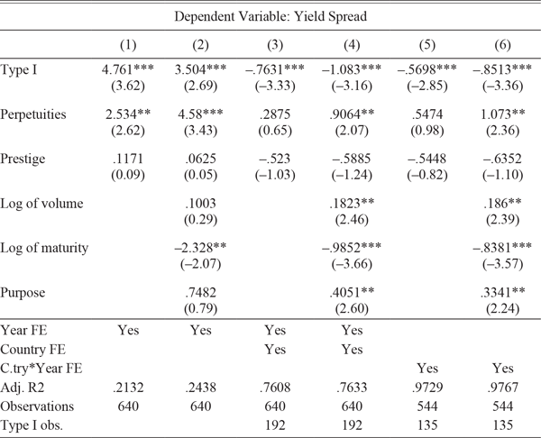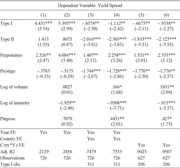 Yield Spread bcyt is the spread over British consols for bond b issued by sovereign c in year y and measured in year t. The independent variable of interest, Type I bcy, is a dummy variable taking value one if the bond includes Type I collateral clauses and zero otherwise; η ct are fixed effects; X bcyt is a matrix of covariates, it includes the log of the total issue size (to control for liquidity), the log of maturity (to control for bond and time-specific ex-ante risk born by the bondholders), a dummy for bonds that were perpetuities,Footnote 55 a dummy for bonds whose documentation contained a detailed statement of the project’s purpose, and a dummy for the prestige of the underwriter. Finally, ɛbcyt is the standard error, clustered at the country and year-of-bond-issuance (cy) level.Footnote 56