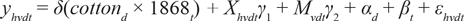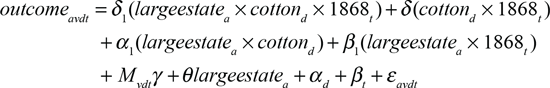 The vector X d consists of time-invariant characteristics of districts: the initial value of the dependent variable in 1848, the proportion of slaves in 1848, the district’s cereals productivity, and the district’s distance to Suez. To account for the potential endogeneity of slavery in 1868, I employ the interaction of the district’s cotton productivity with the post-1877 indicator, as an instrumental variable for Slavery d,1868 × Post 1877t.