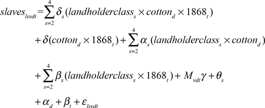 I then employ an augmented empirical specification that studies the heterogeneous effects of the cotton boom on slavery and local employment by landholder class (H1(b), H1(c), and H1(d)). I first use the landholder-level dataset to estimate the following model for slavery: