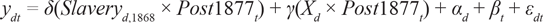 I exploit the variation across districts in the extent of slavery in 1868, on the eve of the abolition, and the time variation of the abolition, where I estimate the following model:
