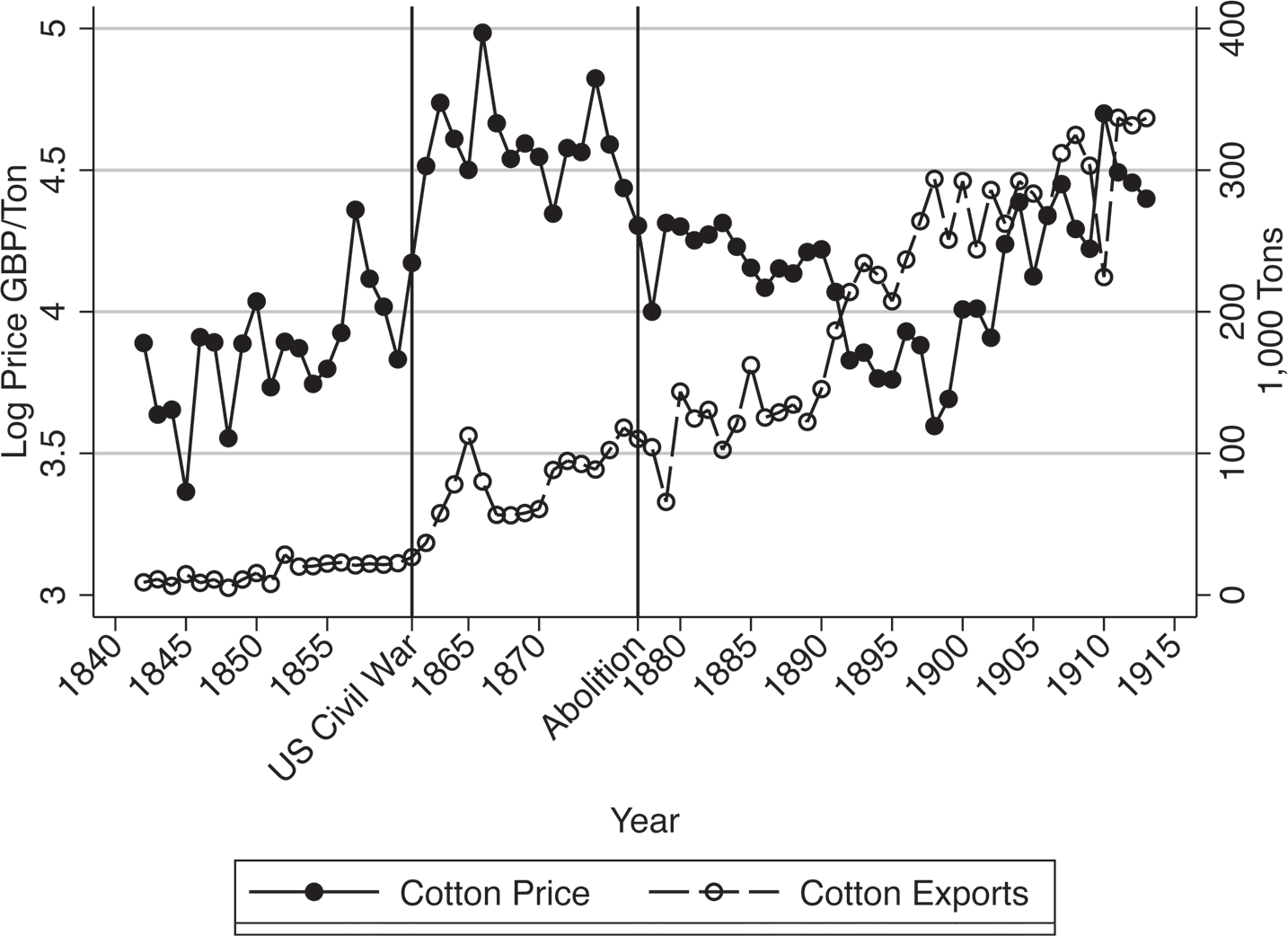 The affinity between cotton and slavery has been long documented (Marx 1861). This association was traced to specific features of cotton production, including effort intensity (Fenoaltea Reference Fenoaltea1984), returns to scale (Fogel Reference Fogel1989), and the relative productivity of women and children (Goldin and Sokoloff Reference Goldin and Sokoloff1984). More recently, the new history of capitalism literature emphasized the intertwined role of cotton and slavery in the historical development of global capitalism (Beckert Reference Beckert2015). In contrast to this thesis, I argue that neither slavery nor state coercion were necessary for cotton cultivation.