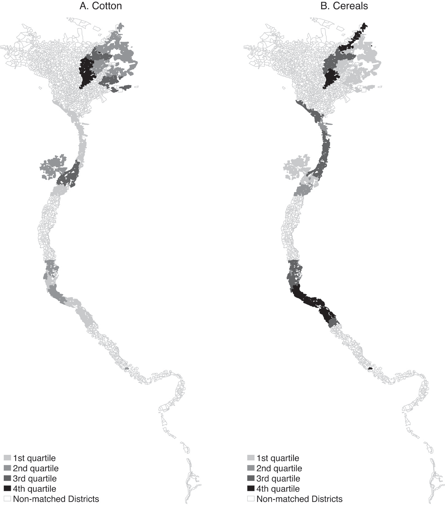 The main explanatory variable is the suitability of cotton cultivation, which I measure at the district level by the cotton yield per unit of land in 1877, based on the 1877 Statistical Yearbook (Ministère de l’Intérieur 1877)—the earliest official statistics on crop productivity at the district level.Footnote 23 Although cotton suitability may have evolved in response to the expansion of perennial irrigation through 1877, it was constrained by temperature and the technological feasibility of construction of summer canals. As a robustness check, I employ alternative measures of cotton suitability, including the Global Agro-Ecological Zones produced by the Food and Agriculture Organization of the United Nations (FAO-GAEZ) (see Online Appendix D). Figure 2 maps the cotton and cereals productivity in 1877 for the matched districts.Footnote 24