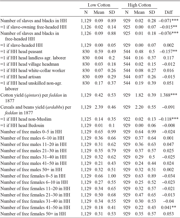 Table 1 shows the baseline differences in 1848 across high-cotton districts, those above the median cotton productivity, and low-cotton districts. The table reveals that slavery was much larger in low-cotton districts, which is consistent with the historical evidence on employing slaves in state-owned plantations and public works in the non-cotton-growing Nile Valley, before the cotton boom (Helal Reference Helal1999, pp. 110–22). High-cotton districts had a higher proportion of landless agricultural laborers, a lower proportion of self-employed peasants, a lower proportion of non-Muslims, and more free female members per household aged 41–50 years, than low-cotton districts.