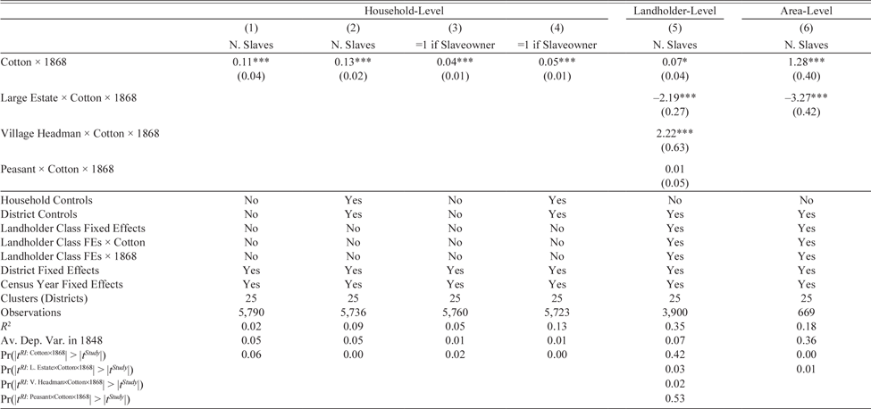 Having established that slavery surged in cotton areas during the cotton boom, I then investigate which landholder class(es) purchased slaves. Consistent with H1(b), Column (5) shows that the positive impact of the cotton boom on slaveholdings is largest among the rural middle class—village headmen in areas outside large estates. Village headmen’s slaveholdings in high-cotton districts surged in 1848–1868 by three slaves per household, compared to their counterparts in low-cotton districts. By contrast, the impact on slaveholdings among owners of large estates is negative, suggesting that the rise in slaveholdings is indeed driven by the rural middle class. The negative effect on slaveholdings in large estates can probably be explained by the rise in coercion of local workers, which I discuss next. Furthermore, I obtain similar results when I estimate the regression at the area level in Column (6), where I find that the positive impact on slaveholdings is driven by landholders in non-large estate areas, that is, non-elite landholders who include the rural middle class.