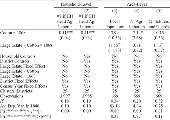 Table 3 shows the effect of the cotton boom on wage employment and state coercion of local labor. Consistent with H1(d), Columns (1) and (2) demonstrate that the cotton boom had a negative and statistically significant impact on wage employment. High-cotton districts witnessed a 13-percentage point decrease in the proportion of agricultural laborers in 1848–1868, relative to low-cotton districts.Footnote 31 Columns (3) and (4) show the heterogeneous effects on the employment of local labor across large estates and non-large estate areas. Consistent with H1(c), Column (3) shows that the cotton boom had a positive and statistically significant effect on the employment of local labor in large estates.Footnote 32 Large estates in high-cotton districts increased their local labor force in 1848–1868 by 61 individuals, on average, relative to large estates in low-cotton districts. As the proportion of the population of large estates declined from 7 percent in 1848 to 3 percent in 1868, this finding implies that large estates became fewer, but larger in size.Footnote 33 Furthermore, Column (4) shows a negative effect on the number of agricultural laborers in non-large estate areas, as predicted by H1(d), and a positive, yet statistically insignificant, effect on the number of agricultural laborers in large estates.