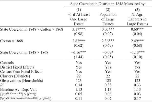 Notes: The dependent variable is the number of slaves in the (rural middle-class) household. The sample is restricted to village headmen. State coercion in district in 1848 is measured by a dummy variable =1 if there was at least one large estate (Column (1)), the population of large estates (Column (2)), and the number of agricultural laborers in large estates (Column (3)). Regressions are weighted by household weights. Controls are the cereals suitability interacted with the 1868 dummy variable. Standard errors clustered at the district level are in parentheses. * p < 0.10, ** p < 0.05, *** p < 0.01. The probabilities (Pr) refer to the randomization inference p-values.