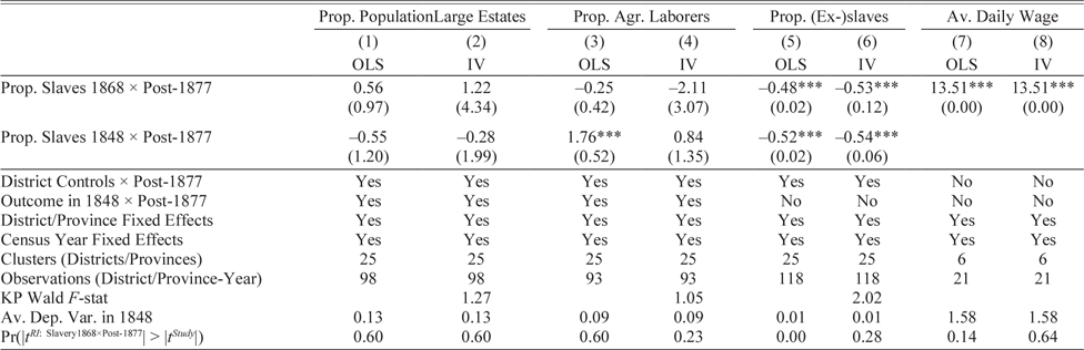 The coefficient δ compares the evolution of outcomes before and after the abolition across districts with different levels of reliance on slavery in 1868. H2(a) predicts that δ > 0 for the proportion of the population in large estates: The abolition of slavery has a positive effect on state coercion of local workers. H2(b) predicts that δ < 0 for the proportion of agricultural laborers because the rise in state coercion will further reduce wage employment. The Conceptual Framework also predicts (by assumption) that δ < 0 for the ex-slave population. Finally, H2(c) predicts that δ > 0 for wages.