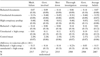 Again, the coefficients for the redacted and unredacted conditions and their associated interaction terms are estimated relative to controls; the key term for testing the second hypothesis is the auxiliary quantity reported below the main coefficient estimates, which represents the difference in the redaction effect (relative to the unredacted condition) between the low and high conspiracy predisposition groups.Footnote 14
