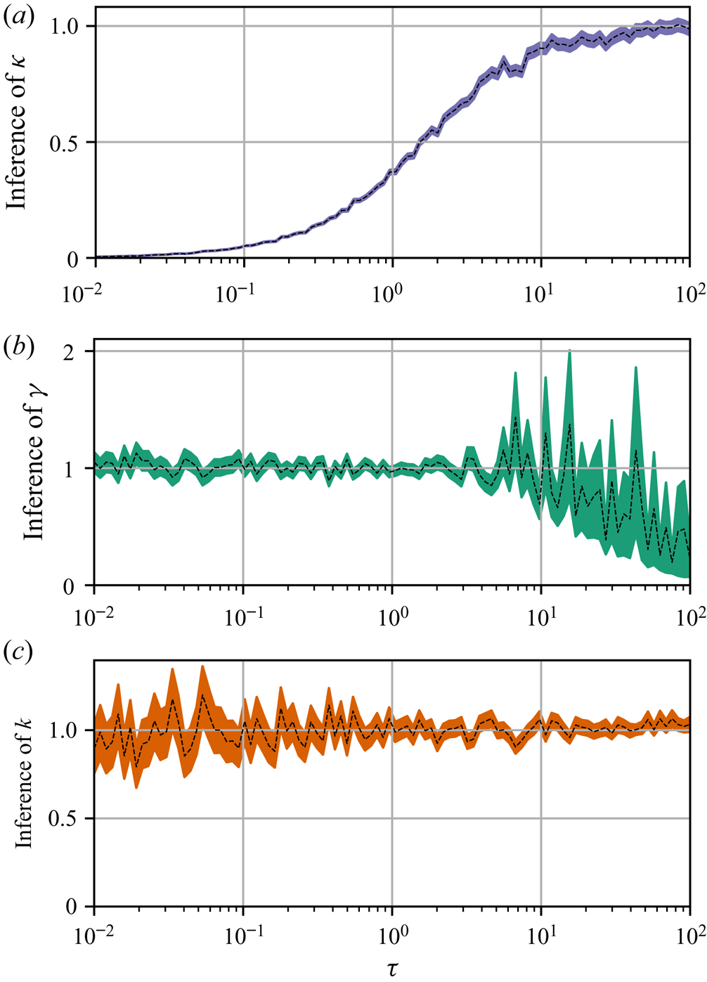 $\tau$, to establish when each model is sampling-time consistent – we say a model is sampling-time consistent when inferred parameter values are stable over a range of