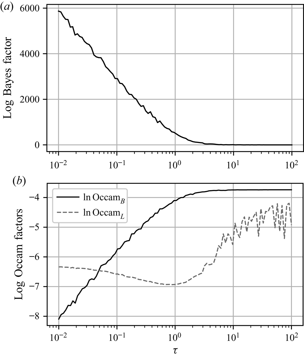 $\tau$ large enough that the Brownian model is sampling-time consistent, its Occam factor is approximately constant and larger than that of the Langevin model. As in the test case in § 4.4, the Occam factor for the Langevin model increases towards that of the Brownian model at large