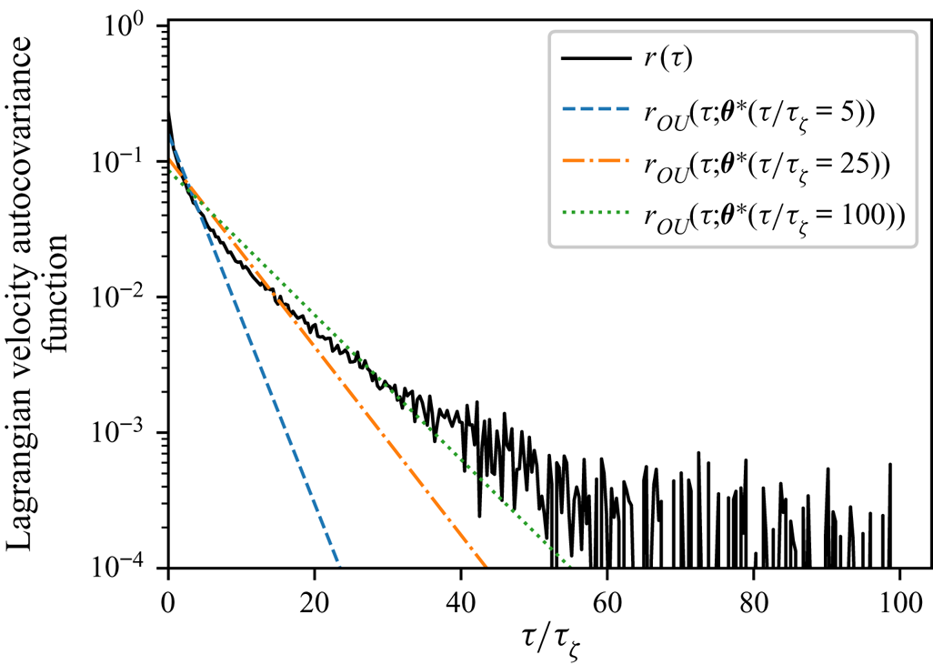 $\tau \gtrsim 150\tau _{\zeta }$), the Langevin model can explain better the dynamics of tracer particles in the turbulence model of § 5.1 on shorter time scales (