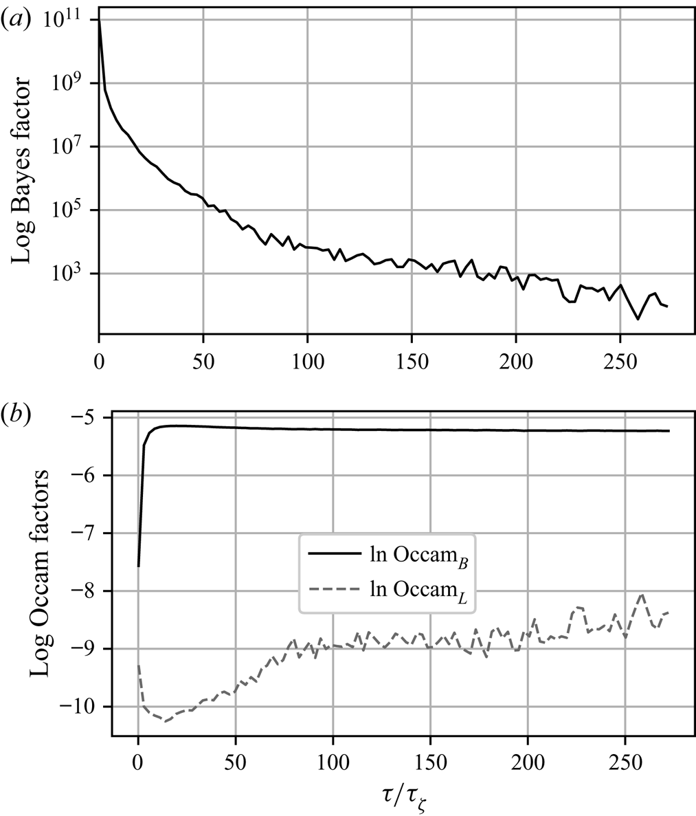 The results of the BMC for the turbulence model data are shown in figure 9. The picture is similar to that in the test case of § 4.4, in that the Bayes factor favours the Langevin model for shorter time scales, but with diminishing strength as