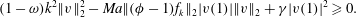 $$\begin{eqnarray}\displaystyle & \displaystyle (1-\unicode[STIX]{x1D714})k^{2}\Vert v\Vert _{2}^{2}-Ma\Vert (\unicode[STIX]{x1D719}-1)f_{k}\Vert _{2}|v(1)|\Vert v\Vert _{2}+\unicode[STIX]{x1D6FE}|v(1)|^{2}\geqslant 0. & \displaystyle\end{eqnarray}$$