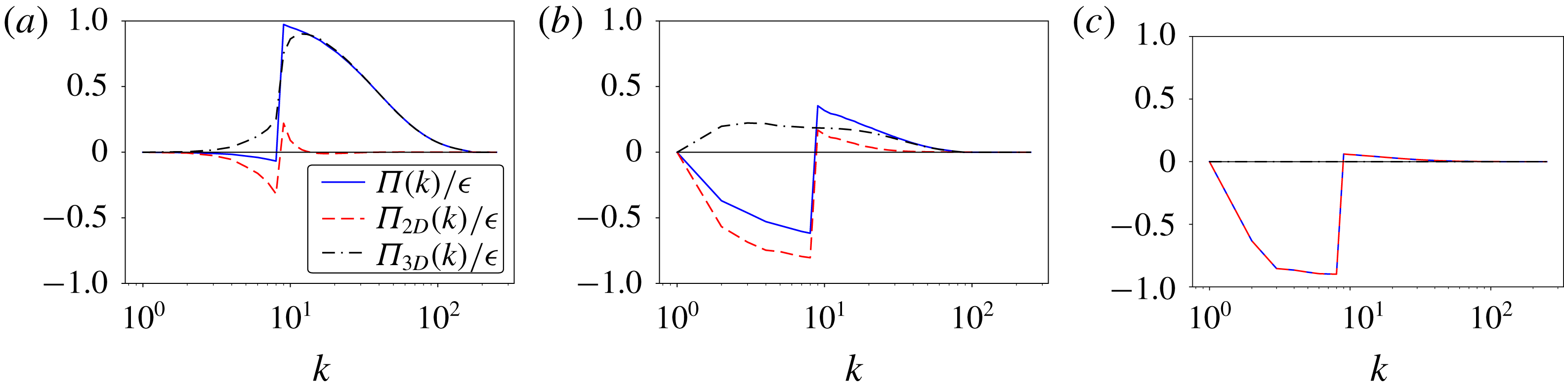 components, i.e. that is a two-dimensional–two-component (2D2C) field. We make this assumption firstly to specifically force the inversely cascading components of the flow and secondly because it is widely used in previous studies such as Smith et al. (Reference Smith, Chasnov and Waleffe1996), Celani et al. (Reference Celani, Musacchio and Vincenzi2010), Deusebio et al. (Reference Deusebio, Boffetta, Lindborg and Musacchio2014), Gallet & Doering (Reference Gallet and Doering2015) and thus enables us to compare more easily with the literature. The force is divergence free, hence it can be written as