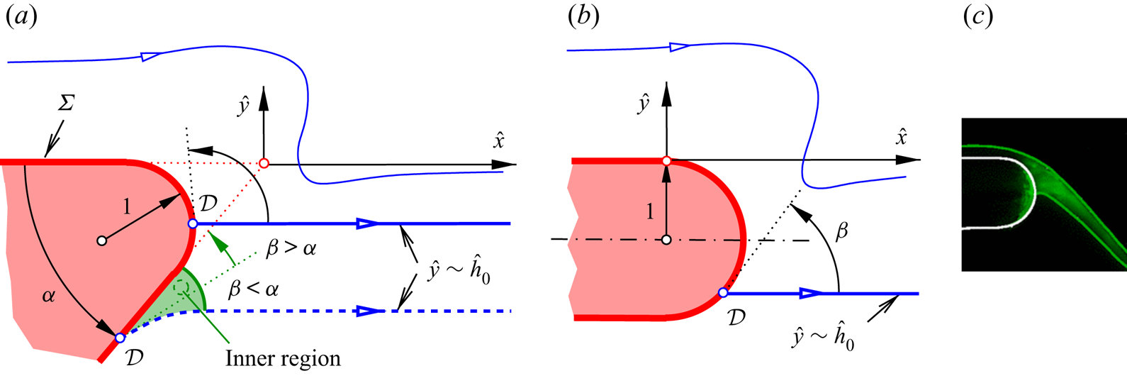 An initial self-consistent clarification of the effect benefited from the quite restrictive assumption of irrotational free-surface flow of a weightless ideal fluid and the neglect of surface tension past a horizontal plate, terminated by the aforementioned lip: remaining firmly attached both with the neglect of gravity (Keller Reference Keller1957) and under gravity (Vanden-Broeck & Keller Reference Vanden-Broeck and Keller1986); detaching grossly from the underside at zero gravity (Vanden-Broeck & Keller Reference Vanden-Broeck and Keller1989). In these investigations, the flow is stipulated to cling to the wall and, due to the absence of viscosity, the position of detachment is also prescribed (Vanden-Broeck & Keller Reference Vanden-Broeck and Keller1989). However, then the well-known Brioullin–Villat condition, met for vanishingly small effects of capillarity (and viscosity), fixes the physically admissible detachment point.