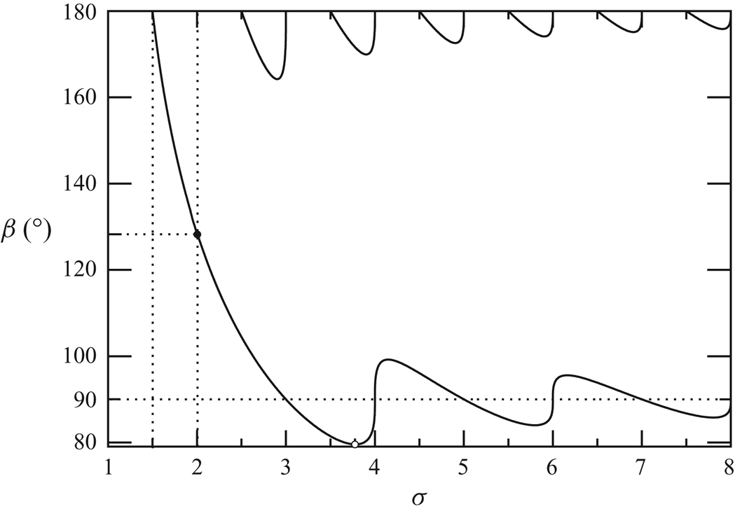 $\beta$ falls below its absolute minimum. Moffatt (Reference Moffatt1964) predicted this well-established threshold as