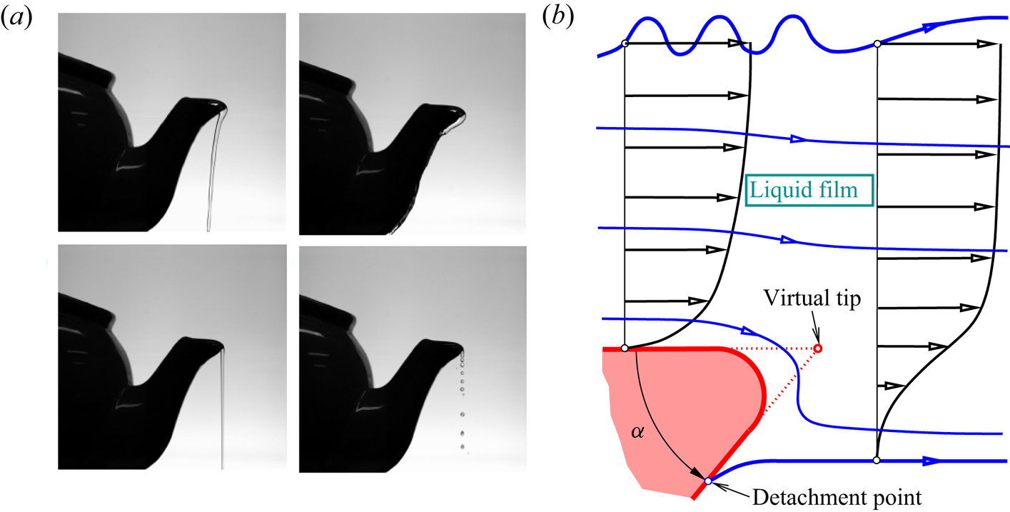 We advocate continuum mechanics for providing a satisfactory, rational unravelling of the effect. In agreement with the above mentioned early observations, we interpret it as a subtle interplay of inertia, capillarity and gravity in a two-dimensional setting. This is crucially tied in with the breakdown of viscous–inviscid interaction and, thus, the slender-layer approximation made on larger scales due to the assumed largeness of the globally defined Reynolds number of the oncoming attached flow. The significance of capillarity and inertia lies also in its proper adjustment immediately upstream of detachment. Our asymptotic theory proposes a fully rational account of the onset of this phenomenon in the realistic situation of a developed incident flow. As a specific ingredient, the trailing edge is replaced by a tip, i.e. a wedge formed by an acute cut-back angle or lip: this ‘attracts’ the liquid film such that it clings to it before the liquid sheet breaks away from it as a whole from its underside. This phenomenon of free rather than forced gross separation from a convex rigid surface, consequently referred to as the teapot effect from here onwards, does not yet have a satisfactorily rigorous and complete description. Duez et al. (Reference Duez, Ybert, Clanet and Bocquet2010) previously considered this ‘inertial-capillary’ mechanism, investigated here in depth and breadth, as a crucial step towards a breakthrough in the explanation of the effect.