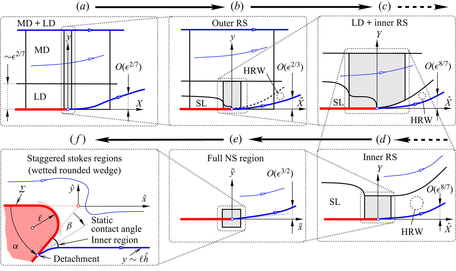 The process of asymptotic scale separation, starting with the largest global scale down to the smallest ones where the teapot effect is at play, guides the structure of our study. Visualising this in figure 3 serves to illustrate and accompany the subsequent analysis of the individual flow regimes governed by those spatial scales. Hence, figure 3( f) recovers the linkage to the teapot effect as in figure 2. From here onwards, we adopt the abbreviations of the flow regions as introduced in figures 1 and 3.