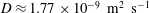 $D\approx 1.77\times 10^{-9}~\text{m}^{2}~\text{s}^{-1}$