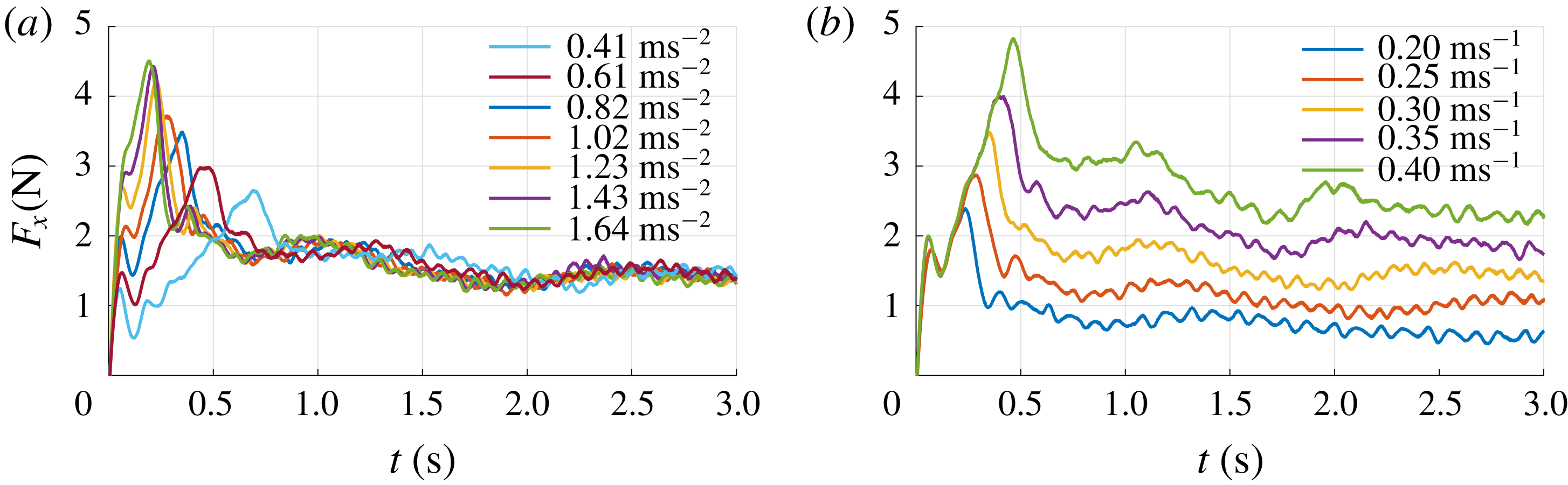 ) based on the measured force signals matches with the flow visualisations (figure 8, and movies available in the supplemental material as movie 1, movie 2 and movie 3) and the vorticity fields (figure 16, supplemental material movie 4). The drag force during the acceleration phase appears to be very complex but is shown to be well behaved: