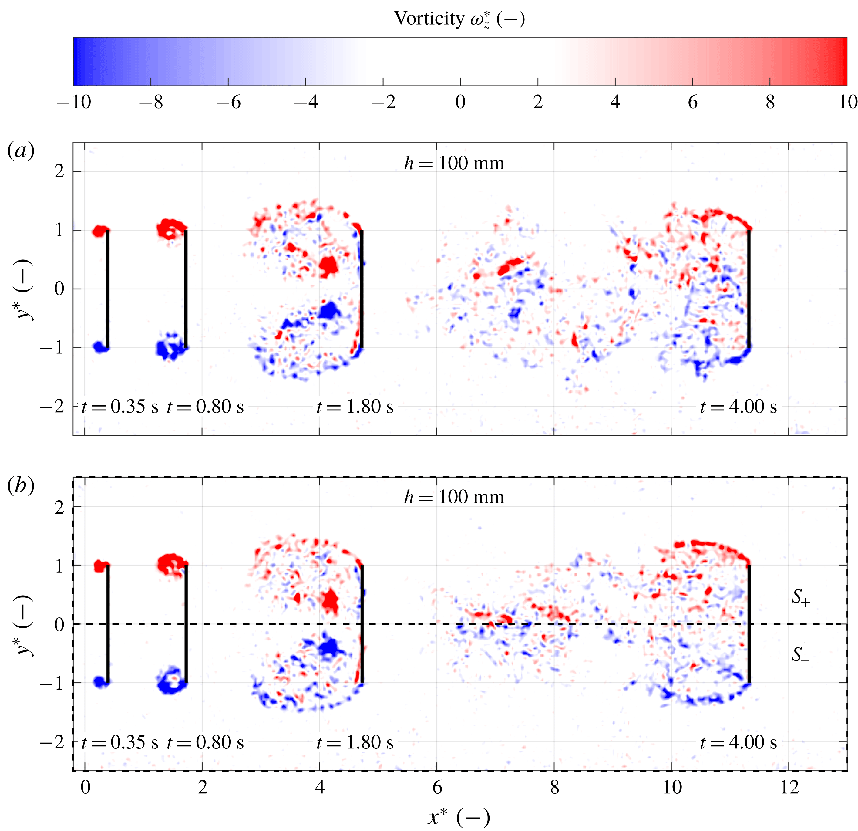 , or is on the very early stages of an accelerating plate, i.e. the first three stages of vortex formation. However, the first three stages already occur within a small motion of the plate, i.e. within a travelled distance of 0.5–1 times the plate height (Xu & Nitsche Reference Xu and Nitsche2015). Each of our experiments runs far into the fourth phase, which has not been investigated in great detail.