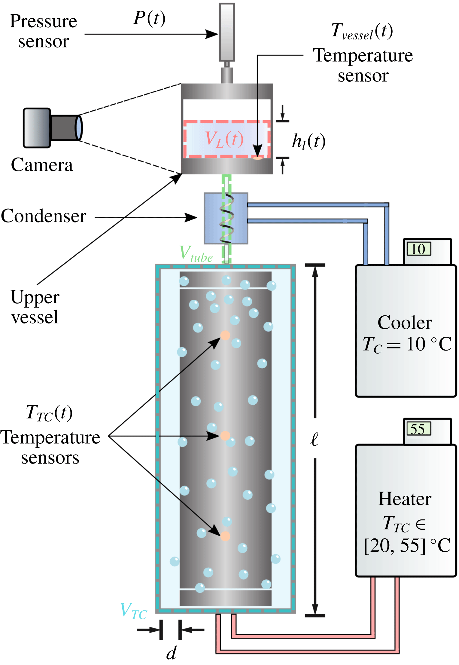 . In order to allow for liquid expansion due to changes in temperature, the cell is connected to a transparent closed cylindrical container which we refer to as the upper vessel. The cell and the upper vessel are connected via plastic tubing and an aluminium heat exchanger which is in direct contact with a water liquid bath. The coil and the liquid bath form a very efficient condenser that condenses liquid back into the cell. The cell of the BTTC, the upper vessel and the tubing that connects them form a closed reservoir; neither liquid nor vapour can leak out of the system.